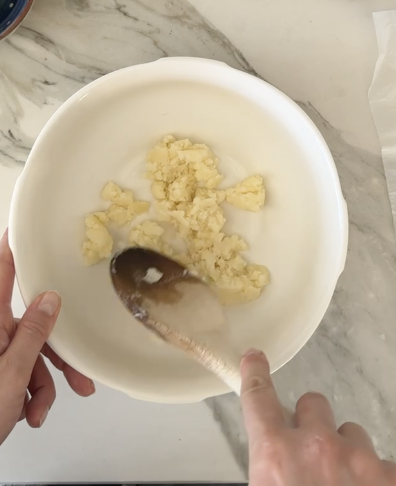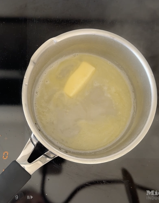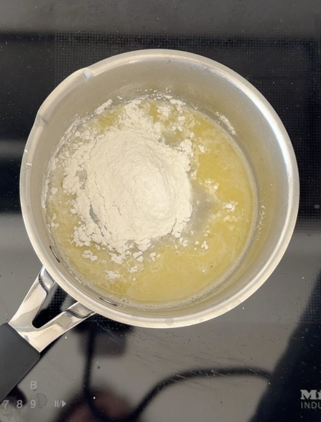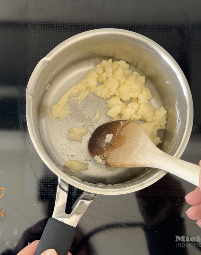 Melt butter and water with a pinch of salt. Then add all the flours and mix quickly with a spoon to incorporate the flours. Cook on low heat until it starts sizzling.